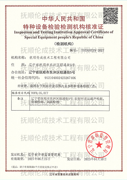 鎶氶『浼︽垚鎶鏈伐紼嬫湁闄愬叕鍙告垚绔嬩簬1996騫?鏈?0鏃ワ紝鏄叿鏈夌嫭绔嬫硶浜鴻祫鏍肩殑媯(gè)楠屾嫻嬫湁闄愯矗浠誨叕鍙搞傚叕鍙鎬笓涓氫粠浜嬬壒縐嶈澶囧帇鍔涘鍣ㄧ殑媯(gè)楠屾嫻嬶紙鍚悊鍖栬瘯楠岋級(jí)宸ョ▼銆傚叕鍙稿叿澶囩壒縐嶈澶囥佸緩璁懼伐紼嬨佺煶娌瑰寲宸ョ瓑琛屼笟鐨勬棤鎹熸楠屾嫻嬭祫鏍鹼紝鍏堝悗鍙栧緱杈藉畞鐪佸競(jìng)鍦虹洃鐫g鐞嗗眬棰佸彂鐨勨滅壒縐嶈澶囨楠屾嫻嬫満鏋勬牳鍑嗚瘉鈥濓紱杈藉畞鐪佸競(jìng)鍦虹洃鐫g鐞嗗眬棰佸彂鐨勨滄楠屾嫻嬫満鏋勮祫璐ㄨ瀹氳瘉涔︹濓紙CMA)錛涜窘瀹佺渷鐢熸佺幆澧冨巺棰佸彂鐨勨滆緪灝勫畨鍏ㄨ鍙瘉鈥濃︹?